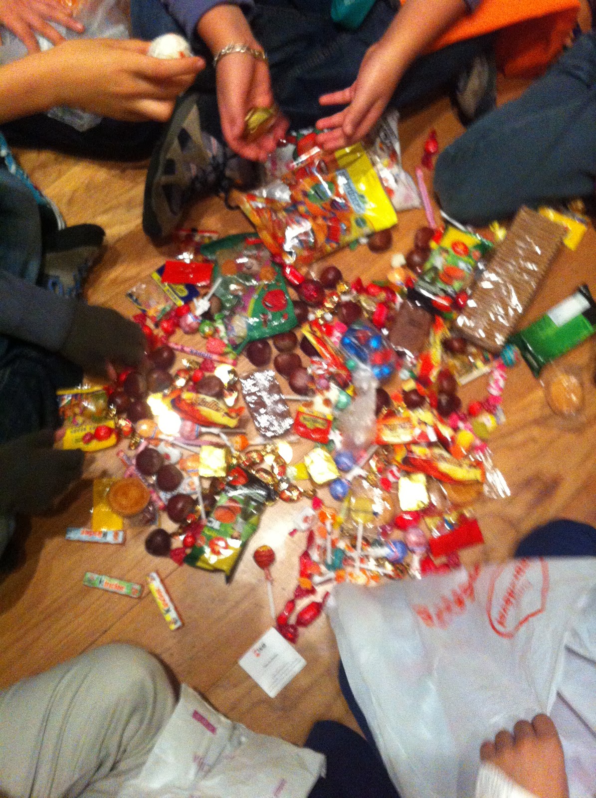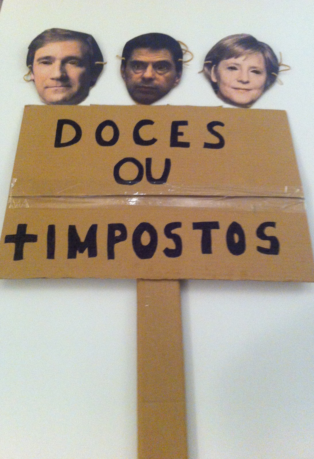 Nós acompanhámos os miúdos mas ficámos, como sempre, nas escadas. Pudémos, por isso, ouvir os comentários e as gargalhadas de alguns vizinhos do nosso prédio e prédios próximos. Houve um senhor que exclamou, horrorizado: «Eh pá, tira-me essa cara que ainda vais apanhar hoje!» Enfim, houve reacções hilariantes. O resultado foi bem menos rico que os anos anteriores. Os miúdos (que eram sete) desabafaram: «A crise está mesmo bera! Nem os doces escapam!»