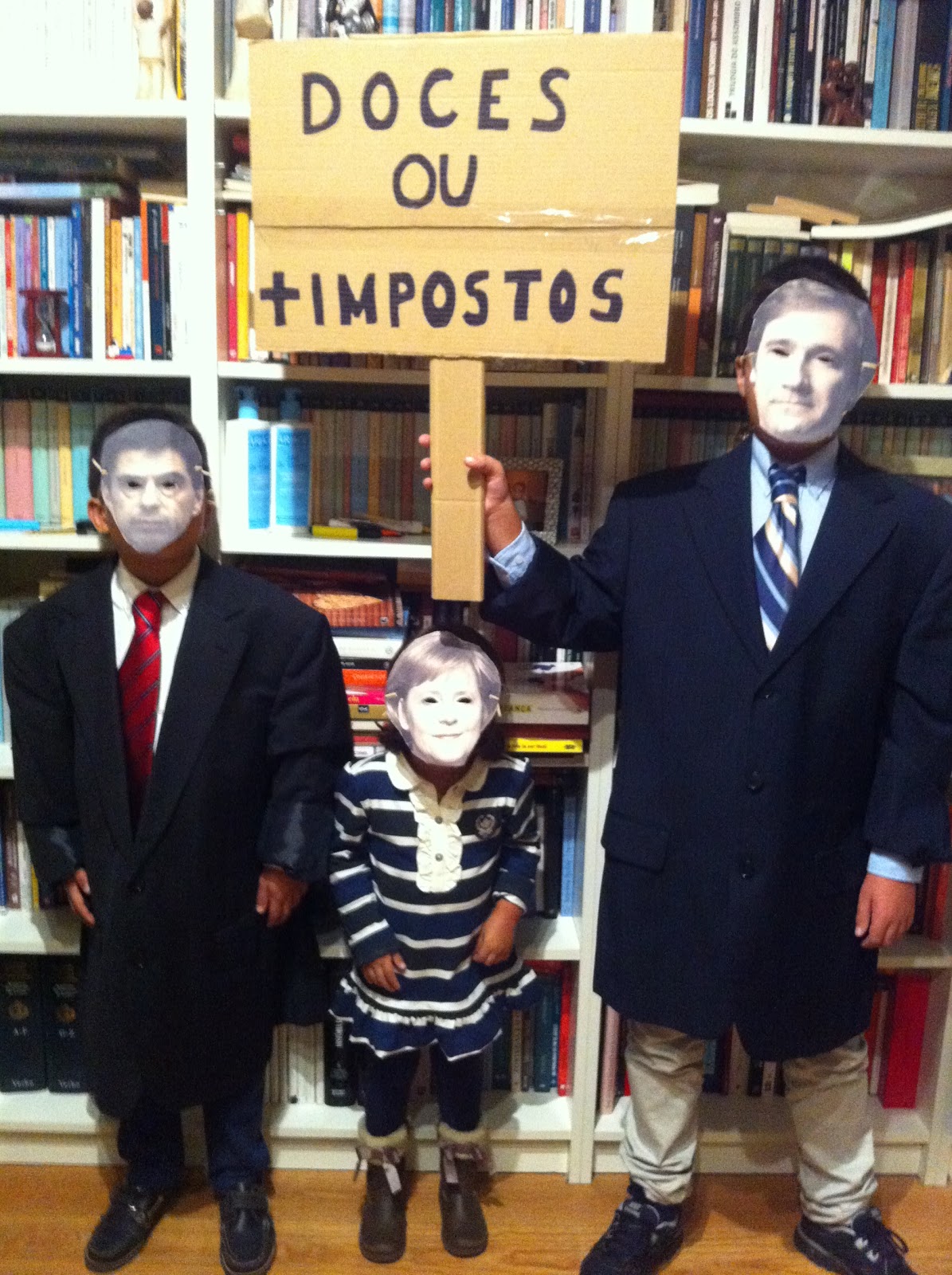 O Manel é que teve a ideia: «Se é para assustar as pessoas, vamos então escolher as personagens certas!» E assim foi. Imprimimos as caras, recortámo-las, colámos em cartão, prendemos elásticos et voilá: máscaras caseiras. Confesso: deu-me particular prazer recortar os olhinhos destas três criaturas (para os meus filhos poderem ver o caminho). Foi assim um momento de sadismo confesso. Adiante. O importante é dizer que este sim, foi um Halloween verdadeiramente assustador!