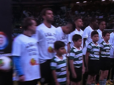 Fomos levar a estrela à porta certa. Depois, eu segui para um lugar que me destinaram e onde me haviam de ir entregar o rapaz depois de entrar com o Rui Patrício. O pai e o Manel foram para os respectivos lugares cativos que têm no estádio, ao lado do avô, e que ficam exactamente do outro lado do estádio (passámos os 90 minutos a acenar uns para os outros feitos parvos).O Martim delirou por ter estado no balneário e por ter entrado de mão dada com o seu ídolo. Veio todo empolgado, a dizer como é grande o Rui Patrício (é mesmo, eu também já estive com ele duas vezes e senti-me uma formiga) e que tinha ligaduras nos dedos. Diz que lhe desejou bom jogo e que teve muito frio (entrou de t-shirt e calções... como é que não havia de ter frio, numa noite como a de hoje?).