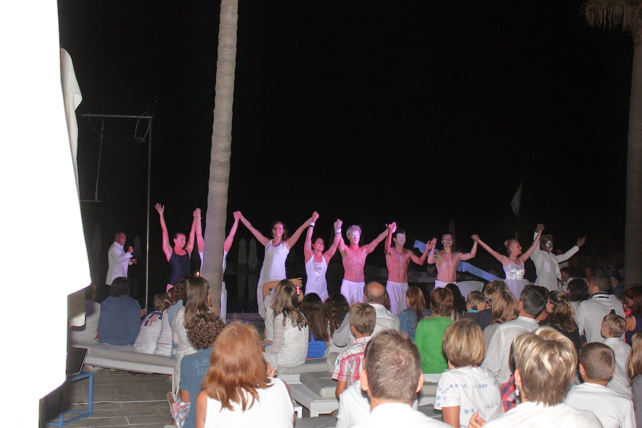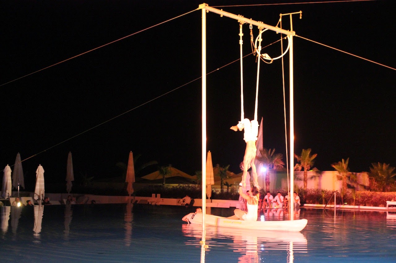 Mas era só o princípio. À tarde já tínhamos percebido que o espectáculo seria junto à piscina, porque pediram que saíssemos um pouco mais cedo (às 19h), mas não contávamos com um número de trapézio dentro de água.