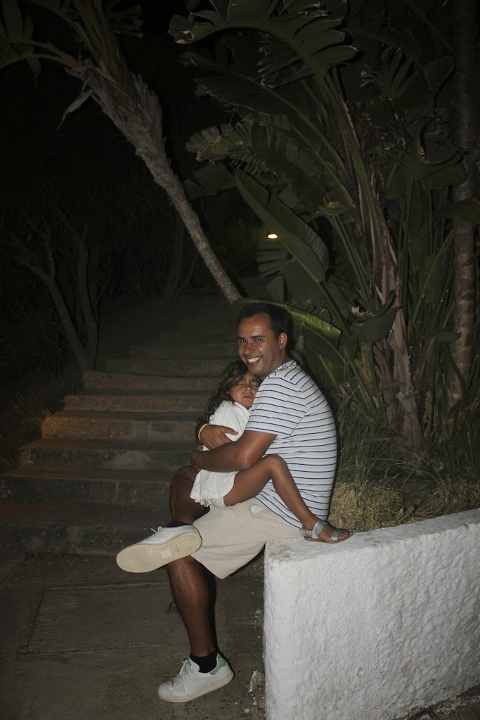 A Madalena adormeceu logo depois do número de circo e ficou a dormir num cadeirão. Quando nos fartámos da rambóia, o Ricardo pegou nela e fomos embora. Acontece que o nosso quarto ficava muuuuito lá em cima - o Club Med Yasmina está distribuído numa espécie de socalco; esta festa ficava mesmo junto ao mar e o nosso quarto ficava lá no topo, com vista. Foi um vê se te avias para a carregar entre ladeiras inclinadas e escadarias. O pai fez várias paragens pelo caminho, pediu ajuda aos rapazes e eu agradeci estar grávida. :)