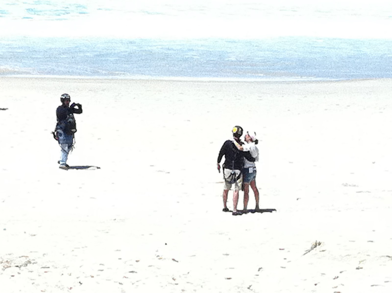 O nosso amigo N. nem sonhava o que o esperava, no dia do seu aniversário (a viagem de helicóptero, apesar de ter sido presente de anos, foi oferecida na véspera). A S. ofereceu ao marido, nem mais nem menos que... um salto de asa delta. Não tenho (ainda) fotos do voo, mas aqui pode ver-se ele já em terra, na Praia do Pepino, com a mulher, e a serem fotografados pelo Mosquito, um dos maiores cromos (se não mesmo o maior) dos voos de asa delta no Rio.