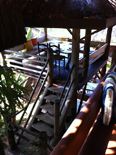 Depois do voo, que ele amou, fomos almoçar a um restaurante que recomendo vivamente! É uma experiência inesquecível. Fica em Santa Teresa, e chama-se Aprazível. E almoça-se... em cima de árvores. Uma espécie de regresso à infância. Cada mesa está posta nesta espécie de casinha misturada com a vegetação e é tudo muito bonito. E bom.